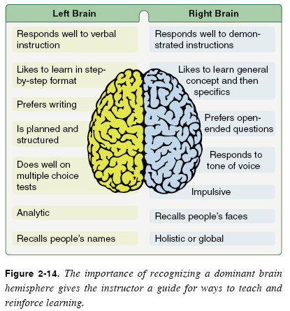Right Brain/Left Brain According to research on the human brain, people have a preferred side of the brain to use for understanding and storing information. While both sides of the brain are involved in nearly every human activity, it has been shown that those with right-brain dominance are characterized as being spatially oriented, creative, intuitive, and emotional. Those with left-brain dominance are more verbal, analytical, and objective. Generally, the brain functions as a whole. For example, the right hemisphere may recognize a face, while the left associates a name to go with the face. While most people seem to have a dominant side, it is a preference, not an absolute. On the other hand, when learning is new, difficult, or stressful, the brain seems to go on autopilot to the preferred side. Recognizing a student’s dominant brain hemisphere gives the instructor a guide for ways to teach and reinforce learning. There are also some people who use both sides of the brain equally well for understanding and storing information. [Figure 2-14]