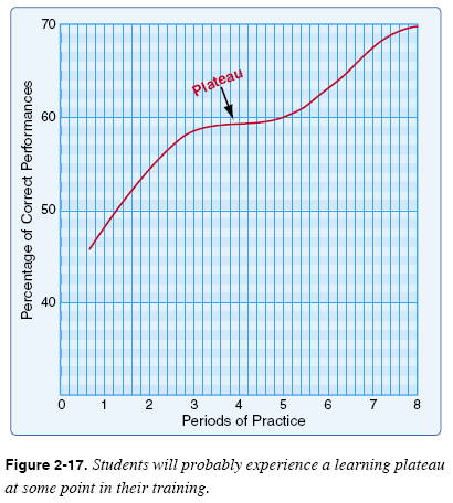 Learning Plateaus Learning plateaus are a normal part of the learning process and tend to be temporary, but instructors and students should be prepared for them. A learning plateau may signify any number of conditions. For example, the student may have reached capability limits, may be consolidating levels of skill, interest may have waned, or the student may need a more efficient method for increasing progress. Instructors themselves can bring on a learning plateau by overpractice. After repeating any task three or four times, give it a break to avoid causing a learning plateau. Keep in mind that the apparent lack of increasing proficiency does not necessarily mean that learning has ceased. The point is that, in learning motor skills, a leveling off process, or plateau, is normal and should be expected after an initial period of rapid improvement. The instructor should prepare the student for this situation to avert discouragement. If the student is aware of this learning plateau, frustration may be minimized. Instructors can help students who fall into a learning plateau by moving the student to a different place in the curriculum and giving the current task a break. Instructors should also be aware that they can bring on a learning plateau by over-practice. Learning plateau problems can sometimes be alleviated also by the instructor better explaining the lesson, the reason for the lesson, and how it applies to the student. |