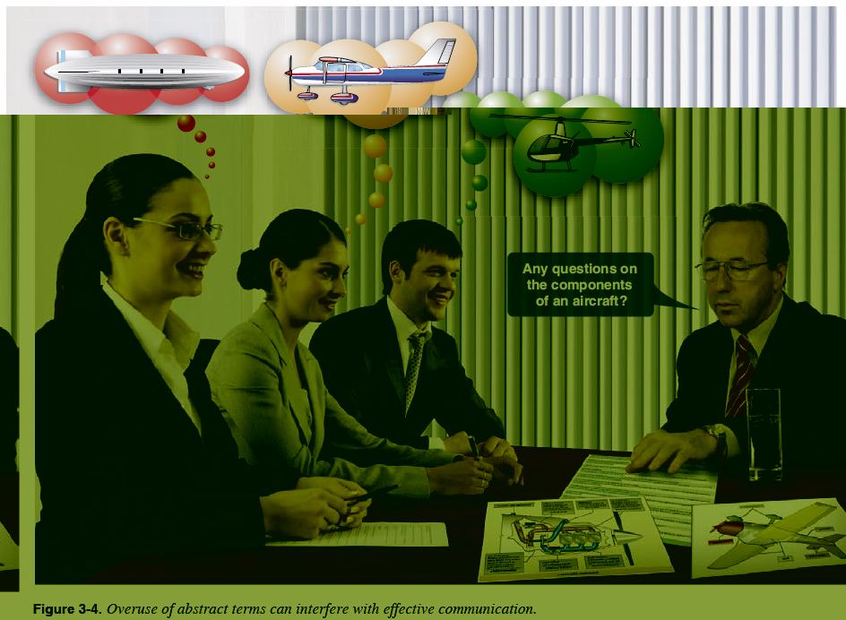 Abstractions are words that are general rather than specific. Concrete words or terms refer to objects people can relate directly to their own experiences. These words or terms specify an idea that can be perceived or a thing that can be visualized. Abstract words, on the other hand, stand for ideas that cannot be directly experienced, things that do not call forth mental images in the minds of the students. The word aircraft is an abstract word. It does not call to mind a specific aircraft in the imaginations of various students. One student may visualize an airplane, another student might visualize a helicopter, and still another student might visualize an airship. [Figure 3-4] Although the word airplane is more specific, various students might envision anything from a Boeing 777 to a Piper Cub.