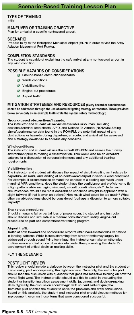 SBT Lesson Plan The SBT lesson plan differs from the traditional lesson plan. [Figure 6-8] In this example, the instructor pilot tells the student to plan for arrival at a specific nontowered airport. The planning should take into consideration the possible wind conditions, arrival paths, airport information and communication procedures, available runways, recommended traffic patterns, courses of action, and preparation for unexpected situations. Upon arrival at the airport, the student makes decisions (with guidance and feedback, as necessary) to safely enter and fly the traffic pattern. This is followed by a discussion of what was done, why it was done, the consequences, other possible courses of action, and how it applies to other airports. In contrast to the student who trained under the traditional lesson plan, the student who trains under the SBT format is not only capable of a specific flight maneuver, he or she is now capable of detailing the safe arrival at any nontowered airport in any wind condition.