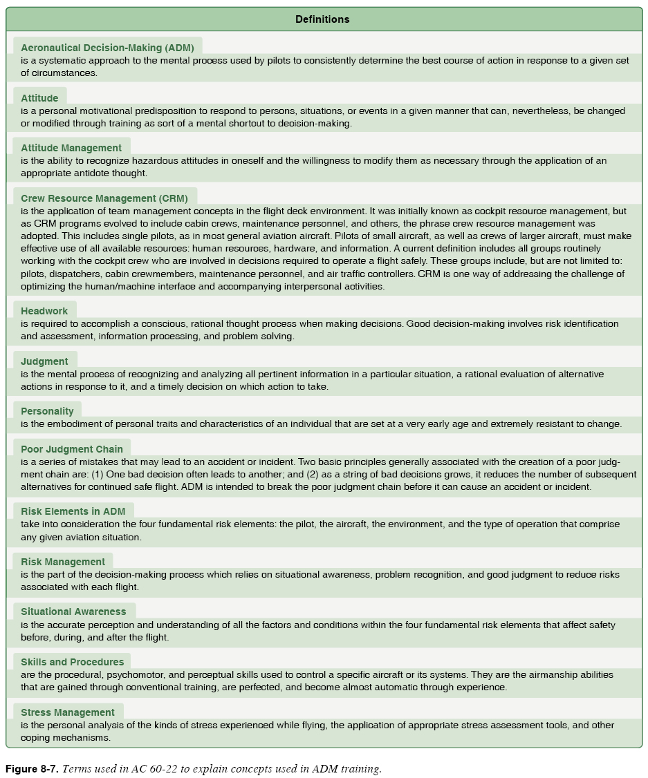 Flight instructors should incorporate ADM, risk management, situational awareness, and SRM throughout the entire training course for all levels of students. AC 60-22, Aeronautical Decision Making, provides background references, definitions, and other pertinent information about ADM training in the GA environment. [Figure 8-7]