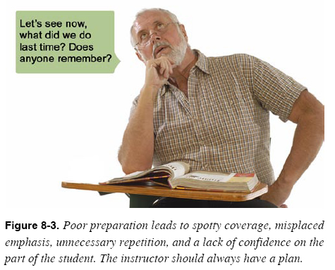 Dehydration and Heatstroke Dehydration is the term given to a critical loss of water from the body. Dehydration reduces a pilot’s level of alertness, producing a subsequent slowing of decision-making processes or even the inability to control the aircraft. The first noticeable effect of dehydration is fatigue, which in turn makes top physical and mental performance difficult, if not impossible. Flying for long periods in hot summer temperatures or at high altitudes increases susceptibility to dehydration since dry air at high altitudes tends to increase the rate of water loss from the body. If this fluid is not replaced, fatigue progresses to dizziness, weakness, nausea, tingling of hands and feet, abdominal cramps, and extreme thirst. Heatstroke is a condition caused by any inability of the body to control its temperature. Onset of this condition may be recognized by the symptoms of dehydration, but also has been known to be recognized only by complete collapse. To prevent these symptoms, it is recommended that an ample supply of water be carried and used at frequent intervals on any long flight, whether the pilot is thirsty or not. If the airplane has a canopy or roof window, wearing light-colored, porous clothing and a hat helps provide protection from the sun. Keeping the flight deck well ventilated aids in dissipating excess heat. Apathy Due to Inadequate Instruction Students can become apathetic when they recognize that the instructor has made inadequate preparations for the instruction being given, or when the instruction appears to be deficient, contradictory, or insincere. To hold the student’s interest and to maintain the motivation necessary for efficient learning, well-planned, appropriate, and accurate instruction must be provided. Nothing destroys a student’s interest as quickly as a poorly organized period of instruction. Even an inexperienced student realizes immediately when the instructor has failed to prepare a lesson. [Figure 8-3]