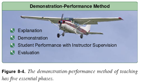 Demonstration-Performance Training Delivery Method The demonstration-performance training delivery method was discussed briefly in Chapter 4, The Teaching Process, but the following in-depth discussion is geared to the flight instructor. This training method has been in use for a long time and is very effective in teaching kinesthetic skills so flight instructors find it valuable in teaching procedures and maneuvers. The demonstration-performance method is divided into four phases: explanation, demonstration, student performance with instructor supervision, and evaluation. [Figure 8-4]
