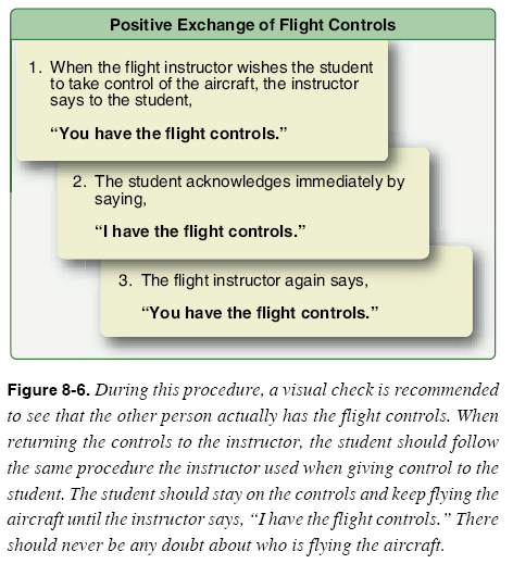 Incident/accident statistics indicate a need to place additional emphasis on the exchange of control of an aircraft by pilots. Numerous accidents have occurred due to a lack of communication or misunderstanding regarding who had actual control of the aircraft, particularly between students and flight instructors. Establishing the following procedure during initial training will ensure the formation of a habit pattern that should stay with students throughout their flying careers.