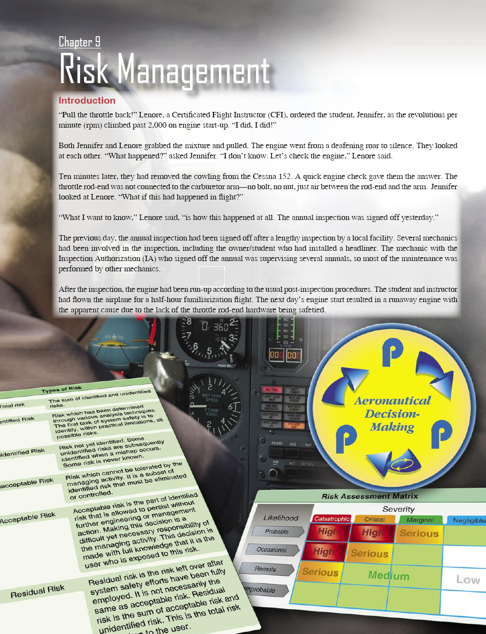 This chapter discusses safety risk management in the aviation community, looking at it as preemptive, rather than reactive. The principles of risk management and the tools for teaching risk management in the flight training environment are addressed in Chapter 8, Techniques of Flight Instruction.