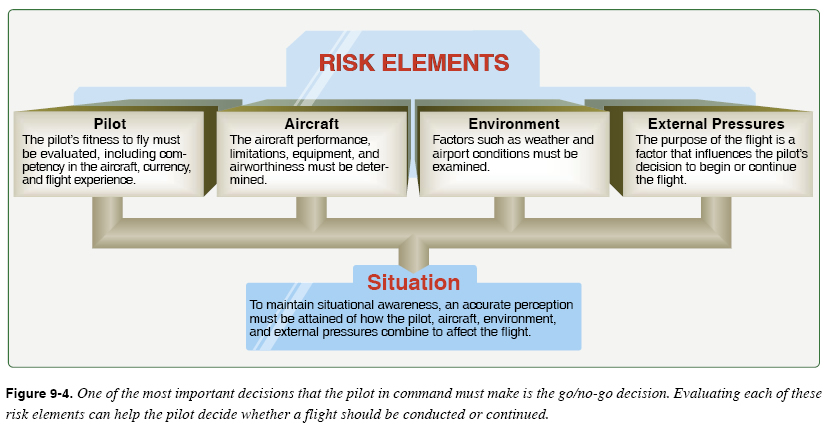 During each flight, decisions must be made regarding events involving interactions between the four risk elements—PIC, aircraft, environment, and external pressures. The decision-making process involves an evaluation of each of these risk elements to achieve an accurate perception of the flight situation. [Figure 9-4]