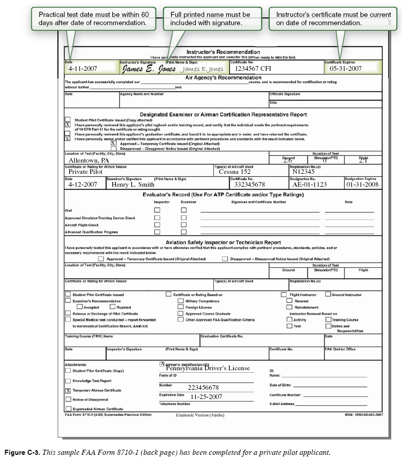 Federal Aviation Administration (FAA) inspectors and designated pilot examiners (DPEs) rely on flight instructor recommendations for student or pilot applicant testing. These recommendations are accepted as evidence of qualification for certification and proof that a review of the subject areas found to be deficient on the appropriate knowledge test has been given by the flight instructor. Recommendations also provide assurance the applicant has had a thorough briefing on the Practical Test Standards (PTS) and the associated knowledge areas, maneuvers, and procedures. If the flight instructor has trained and prepared the applicant competently, the applicant should have no difficulty in passing the written and practical tests. Sport Pilot Many consider the advent of the sport pilot certification to be one of the most significant changes to the airman certification structure to have occurred in over 50 years. Because of the growing cost to acquire the private pilot certification, more and more aviation enthusiasts are considering the sport pilot as an alternative. Many aircraft already meet the light sport aircraft criteria, and many manufacturers are now producing modern light sport aircraft. It is likely that flight instructors will be asked to provide information, and possibly, training for this new certificate. Flight instructors should review 14 CFR part 61, subparts J and K, for the requirements for, and privileges and limitations of, the sport pilot certifications as well as the new endorsement requirements. Of particular interest has been the medical requirement. Subparts J and K also describe the process for sport pilots and flight instructors with a sport pilot rating to add additional category/class privileges. Since light sport aircraft must meet certain criteria, a well-informed flight instructor would be expected to be acquainted with the basic requirements. FAA Forms 8710-1, 8610-2, and 8710-11 Forms 8710-1, 8610-2, and 8710-11 are the print versions of the Airman Certificate and/or Rating Application. Again, the instructor ensures the applicant is prepared for the test and has met all the regulatory requirements, including knowledge, proficiency, required endorsements, and experience requirements before the application process. The applicant then either completes the 8710 or 8610 paper form by hand or completes a digital computer-based form found on the FAA website. This form is in PDF. Remind the student that while the form can be completed online, the data cannot be saved and the applicant must print a copy before closing the window or the data will be lost. Instructions for completing the form are available on the website. After printing the requisite form, the applicant physically signs it and then the instructor verifies the information and signs the form, which the DPE mails to the nearest FSDO. Downloadable versions of the FAA Forms 8710-1 and 8610-2 are available at www.faa.gov/library/forms/. Figures C-2 and C-3 are examples of a private pilot applicant who received training under 14 CFR part 61. This is only an example, since the form is periodically revised to reflect changes in the applicable rules and regulations. If the current form is a later edition than the one shown here, the instructions must be read very carefully to ensure all areas of the form are filled out correctly. The example shown is annotated with additional guidance to clarify or reinforce certain areas that are frequently found incomplete by the FAA during the certification process. Instructor Records 14 CFR part 61 requires the flight instructor to maintain a record that includes information on the type of endorsement, the name of the person receiving the endorsement, and the date of the endorsement. This information must be kept in a logbook or a separate document. For a knowledge or practical test endorsement, the record must include the kind of test, the date, and the results. Records of endorsements must be maintained for at least 3 years. Knowledge Tests When preparing an applicant for the private certification or higher grade rating (e.g., commercial or instrument), a test is required to ensure the student has adequate aeronautical knowledge in those subject areas listed in 14 CFR part 61. The flight instructor may provide the student with an endorsement to certify he or she has the required knowledge to pass the knoweldge test. Some additional ratings do not require a knowledge test. For information concerning additional aircraft certifications that do not require knowledge tests, refer to AC 61-65. Flight instructors must take a short question test for additional category. As a general rule the following may be used to determine if a knowledge test for Private, Commercial, or Instrument rating is required, but the flight instructor should review 14 CFR part 61. If the applicant fails a knowledge test, the flight or ground instructor must sign the written test after he or she has given additional training for a retake of the test. Additional Training and Endorsements Flight instructors often provide required training and endorsements for certificated pilots. AC 61-98, Currency and Additional Qualification Requirements for Certificated Pilots, contains information to assist the instructor in providing training/endorsements for flight reviews, instrument proficiency checks, and transitions to other makes and models of aircraft. Included in the AC are general guidance in each of these areas, references to other related documents, and sample training plans that are pertinent to this type of training.