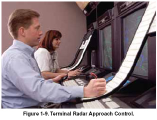 Terminal Radar Approach Control (TRACON) controllers work in dimly lit radar rooms located within the control tower complex or in a separate building located on or near the airport it serves. [Figure 1-9] Using radarscopes, these controllers typically work an area of airspace with a 50-mile radius and up to an altitude of 17,000 feet. This airspace is configured to provide service to a primary airport, but may include other airports that are within 50 miles of the radar service area. Aircraft within this area are provided vectors to airports, around terrain, and weather, as well as separation from other aircraft. Controllers in TRACONs determine the arrival sequence for the control tower’s designated airspace.