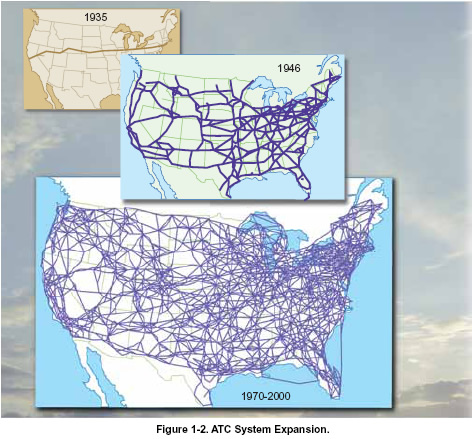 About two decades after the introduction of powered flight, aviation industry leaders believed that the airplane would not reach its full commercial potential without federal action to improve and maintain safety standards. In response to their concerns, the U.S. Congress passed the Air Commerce Act of May 20, 1926, marking the onset of the government’s hand in regulating civil aviation. The act charged the Secretary of Commerce with fostering air commerce, issuing and enforcing air traffic rules, licensing pilots, certifying aircraft, establishing airways, and operating and maintaining aids to air navigation. As commercial flying increased, the Bureau of Air Commerce— a division of the Department of Commerce—encouraged a group of airlines to establish the first three centers for providing ATC along the airways. In 1936, the bureau took over the centers and began to expand the ATC system. [Figure 1-2] The pioneer air traffic controllers used maps, blackboards, and mental calculations to ensure the safe separation of aircraft traveling along designated routes between cities.