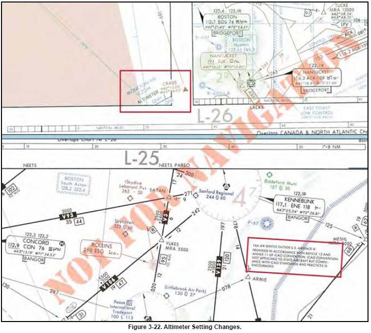When flight crews transition from the U.S. NAS to another country’s airspace, they should be aware of differences not only in procedures but also airspace. For example, when flying into Canada regarding altimeter setting changes, as depicted in Figure 3-22 on page 3-18, notice the change from QNE to QNH when flying northbound into the Moncton flight information region (FIR), an airspace of defined dimensions where flight information service and alerting service are provided. Transition altitude (QNH) is the altitude in the vicinity of an airport at or below which the vertical position of the aircraft is controlled by reference to altitudes (MSL). The transition level (QNE) is the lowest flight level available for use above the transition altitude. Transition height (QFE) is the height in the vicinity of an airport at or below which the vertical position of the aircraft is expressed in height above the airport reference datum. The transition layer is the airspace between the transition altitude and the transition level. If descending through the transition layer, set the altimeter to local station pressure. When departing and climbing through the transition layer, use the standard altimeter setting (QNE) of 29.92 inches of Mercury, 1013.2 millibars, or 1013.2 hectopascals. Remember that most pressure altimeters are subject to mechanical, elastic, temperature, and installation errors. Extreme cold temperature differences also may require a correction factor.