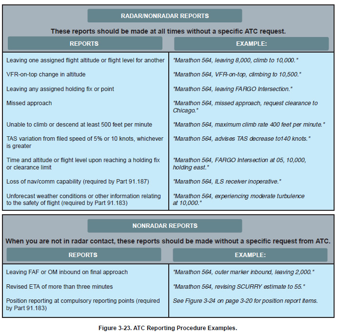 In addition to acknowledging a handoff to another Center en route controller, there are reports that should be made without a specific request from ATC. Certain reports should be made at all times regardless of whether a flight is in radar contact with ATC, while others are necessary only if radar contact has been lost or terminated. Refer to Figure 3-23 on page 3-19 for a review of these reports.