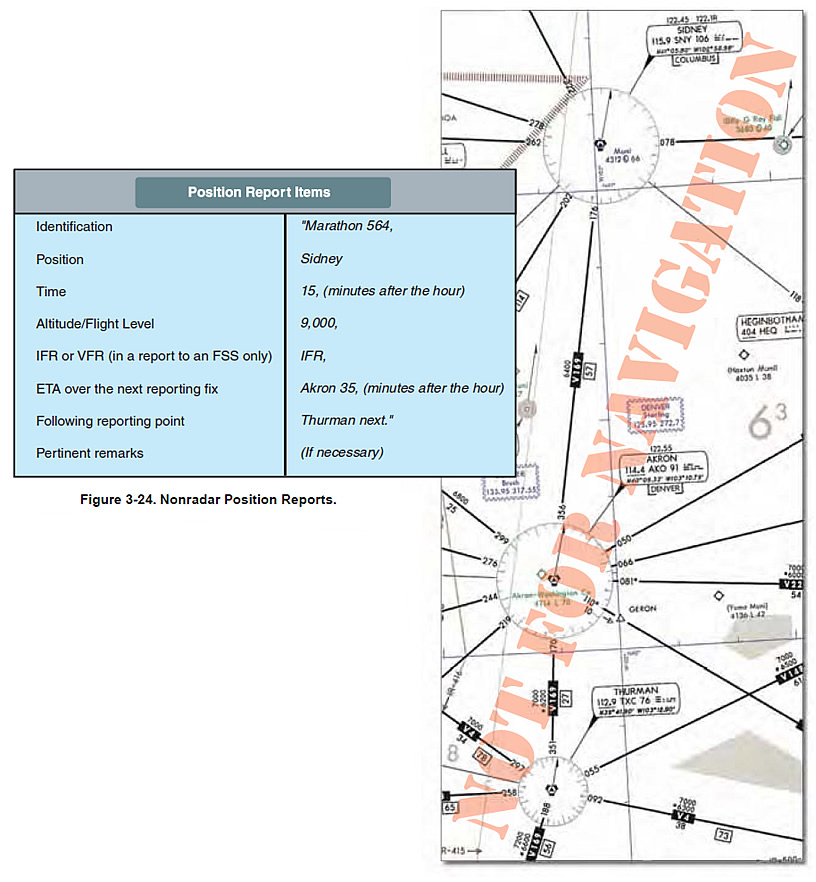 If radar contact has been lost or radar service terminated, the CFRs require pilots to provide ATC with position reports over designated VORs and intersections along their route of flight. These compulsory reporting points are depicted on NACO IFR en route charts by solid triangles. Position reports over fixes indicated by open triangles are noncompulsory reporting points, and are only necessary when requested by ATC. If on a direct course that is not on an established airway, report over the fixes used in the flight plan that define the route, since they automatically become compulsory reporting points. Compulsory reporting points also apply when conducting an IFR flight in accordance with a VFR-on-top clearance. Whether a route is on airways or direct, position reports are mandatory in a nonradar environment, and they must include specific information. A typical position report includes information pertaining to aircraft position, expected route, and estimated time of arrival (ETA). Time may be stated in minutes only when no misunderstanding is likely to occur. [Figure 3-24 on page 3-20]