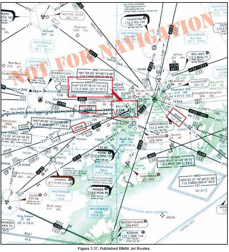 Notice in Figure 3-37 that this en route chart excerpt depicts three published RNAV jet routes, J804R, J888R, and J996R. The “R” suffix is a supplementary route designator denoting an RNAV route. The overlapping symbols for the AMOTT intersection and waypoint indicate that AMOTT can be identified by conventional navigation or by latitude and longitude coordinates. Although coordinates were originally included for aircraft equipped with INS systems, they are now a good way to cross check between the coordinates on the chart and in the FMS or GPS databases to ensure you are tracking on your intended en route course. The AMOTT RNAV waypoint includes bearing and distance from the ANCHORAGE VORTAC. In an effort to simplify the conversion to RNAV, some controlling agencies outside the U.S. have simply designated all conventional routes as RNAV routes at a certain flight level.