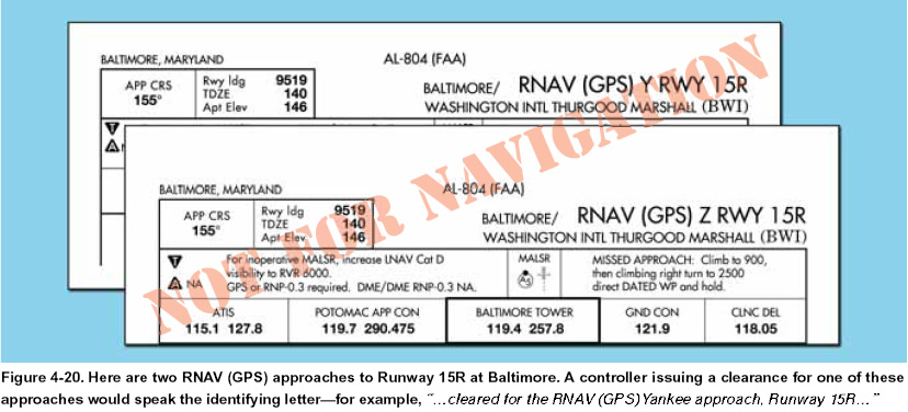In setting up for the expected approach procedure when using an RNAV, GPS, or FMS system, it is important to understand how multiple approaches to the same runway are coded in the database. When more than one RNAV procedure is issued for the same runway, there must be a way to differentiate between them within the equipment’s database, as well as to select which procedure you want to use. (Multiple procedures may exist to accommodate GPS receivers and FMSs, both with and without VNAV capability.) Each procedure name incorporates a letter of the alphabet, starting with Z and working backward through Y, X, W, and so on. (Naming conventions for approaches are covered in more depth in the next chapter.) [Figure 4-20]