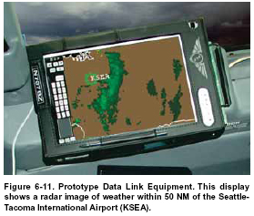Interpreting written or spoken weather information is not difficult, nor is visualizing the relationship of the weather to the aircraft’s route, although verbal or textual descriptions of weather have inevitable limitations. Color graphics can show more detail and convey more information, but obtaining them in flight has been impractical, until recently. The graphical weather service (GWS) provides a nationwide precipitation mosaic, updated frequently, and transmitted to the aircraft and displayed in the cockpit. Whether the display is used to strategize navigation, to avoid weather en route, or for departures and approaches, consideration must always be given to the timeliness of the graphic update. Pilots can select any portion of the nationwide mosaic with range options of 25, 50, 100, and 200 NM. In addition to providing information on precipitation, this service can be expanded to include other graphical data. Some systems will place the detailed weather graphics directly on a moving map display, removing another step of interpretation and enabling pilots to see the weather in relation to their flight path. [Figure 6-11]