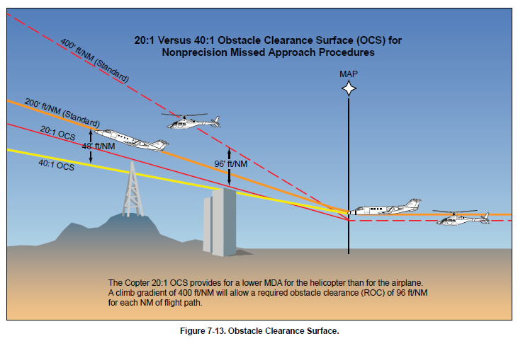The missed approach segment TERPS criteria for all Copter approaches take advantage of the helicopter’s climb capabilities at slow airspeeds, resulting in high climb gradients. [Figure 7-13 on page 7-14] The OCS used to evaluate the missed approach is a 20:1 inclined plane. This surface is twice as steep for the helicopter as the OCS used to evaluate the airplane missed approach segment. The helicopter climb gradient is therefore required to be double that of the airplane’s required missed approach climb gradient.