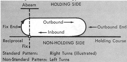 Standard Holding Pattern (No Wind). At or below 14,000 feet, the standard holding pattern (Fig. 12-5) is a racetrack pattern requiring approximately 4 minutes to execute. The aircraft follows the specified course inbound to the holding fix, turns 180° to the right, flies a parallel straight course outbound for one minute, turns 180° to the right, and flies the inbound course to the fix.