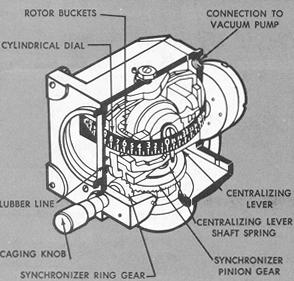 The source of power for the gyro is the engine-driven vacuum pump (or venturi) which sucks air from the rear of the instrument case. This causes air under atmospheric pressure to pass through the filtering system, thence through an air bearing into the hollow vertical gimbal ring. The air then passes through the air nozzle and jets, striking the rotor at a point just above the plane of the horizontal gimbal.