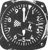 The encoding altimeter (Fig. 4-10) operates in conjunction with the aircraft's ATC transponder which is described on page 123. The transponder is nothing more than a receiver-transmitter which receives a coded interrogation signal from a round radar site and transmits a coded signal back to the ground site. The interrogation signal from the ground consists of two pulses, either 8 micro-seconds or 21 micro-seconds apart. The transponder receives the pulses and determines the spacing. If the 8 micro-seconds signal is received, the transponder is activated and transmits a "Mode A" signal. If the 21 micro-seconds signal is received, the transponder is activated and will transmit altitude information (a Mode C signal).