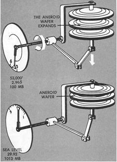 The basic component of the pressure altimeter is the aneroid wafer (Fig. 4-5). A stack of these hollow, elastic metal wafers expands or contracts as atmospheric pressure changes, and through a shaft and gearing linkage, rotates the pointers on the dial of the instrument. For each pressure level, the aneroid assumes a definite size and causes the hands to indicate height above whatever pressure level is set into the altimeter setting window.