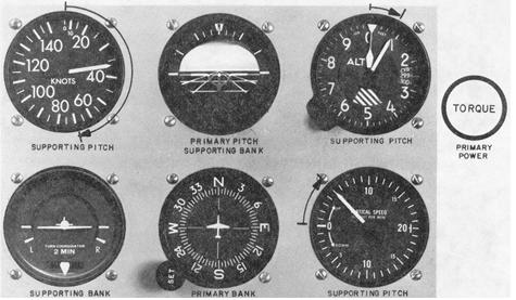 After checking all instruments for indications, start the takeoff by applying collective pitch and a predetermined power setting (normally 10 percent torque above hover power - but not exceeding maximum allowable power). Add power smoothly and steadily to gain airspeed and altitude simultaneously, and to prevent settling to the ground. As power is applied and the helicopter becomes airborne, pedals are used initially to maintain the desired heading. At the same time, apply forward cyclic to begin the acceleration to climbing airspeed. During the initial acceleration, the pitch attitude of the helicopter, as read on the attitude indicator, should be one to two bar widths low. The primary and supporting instruments after becoming airborne are illustrated in Figure 6-14. As the airspeed increases to the appropriate climb airspeed, adjust pitch gradually to climb attitude (see Figure 6-9). As climb airspeed is reached, reduce power to the climb power setting and transition to a fully coordinated straight climb