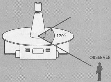 Principles of Operation. VOR operation is based upon the principle that the phase difference between two AC voltages may be used to determine azimuth location. The principle may be more readily visualized by imagining two light signals, both at the same geographic position. The first light is a flashing (reference) signal, visible from any point around the compass. The second light is a narrow beam (variable signal) that rotates continuously at a specific rate. Thus, if you are at any point around the circle, you will see the rotating beam only at the instant it sweeps past your position. Assume that the reference light flashes only when the rotating (variable) beam passes through magnetic north to indicate that the two signals are "in phase." If the rotating beam completes one revolution per minute, you can determine your bearing to the light sources from any point around the compass rose by noting the time interval between your observations of flashing and beam signals. For example, if the two signals are in phase at north (flashing), and you see the rotating beam 20 seconds later, the variable signal has made 20/60 of a revolution. Thus, you must be viewing the beam from a position on the 120 radial (20/60 times 360°, equals 120°), as shown in Figure 7-12. In terms of azimuth, the reference and variable signals are 120° "out of phase."