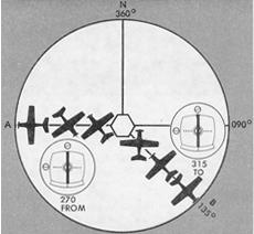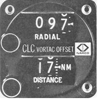 Although cockpit displays of guidance information vary, the displacement of a vertical reference means distance from a selected track in nautical miles and not angular displacement. The guidance instrument in one model, Figure 7-22, resembles a conventional VOR course deviation indicator. The familiar CDI needle serves as a course line computer indicator in the CLC (course line computer) mode. A lateral deflection of the needle indicates nautical miles right or left of the selected course. Each dot on the horizontal scale may have any value such as 0.5, 1, 2, or 10 nautical miles. A DME indicator gives distance to the waypoint.