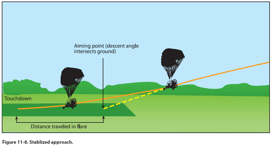The objective of a stabilized approach is to select an appropriate touchdown point on the runway, and adjust the glidepath so the true aiming point and the desired touchdown point basically coincide. Immediately after rolling out on final approach, you should adjust the power so the powered parachute is descending directly toward the aiming point. With the approach set up in this manner, you will be free to devote full attention toward outside references. You should not stare at any one place, but rather scan from one point to another, such as from the aiming point to the horizon, to the trees and bushes along the runway, to an area well short of the runway, and back to the aiming point. In this way, you will be more apt to perceive a deviation from the desired glidepath, and whether or not the powered parachute is proceeding directly toward the aiming point.