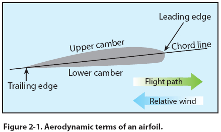 Camber refers to the curvature of a wing when looking at a cross section. A wing possesses upper camber on its top surface and lower camber on its bottom surface. Leading edge describes the forward edge of the airfoil. The rear edge of the airfoil is called the trailing edge. The chord line is an imaginary straight line drawn from the leading edge to the trailing edge. [Figure 2-1]