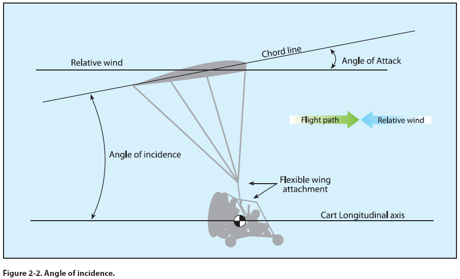 Angle of incidence is the angle formed by the chord line of the wing and the longitudinal axis of the PPC cart. The cart longitudinal axis is not the same as the aerodynamic longitudinal axis defined in the previous paragraph. [Figure 2-2] Unlike an airplane, the angle of incidence can change in flight because of the flexible line attachment between the wing and the cart. Angle of incidence can change for different types of flight configurations and PPC designs; this is covered in detail in the “Moments” section.