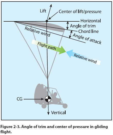 Trim angle is the angle between the chord line of the wing and the horizontal plane when the PPC is in nonpowered gliding flight. [Figure 2-3] The PPC wing is designed at a slight angle, with the chord line inclined downward to the horizontal plane to maintain the manufacturer-designed angle of attack during gliding, level and climbing flight. This “trim angle” is built into the powered parachute by the manufacturer and cannot be adjusted by the pilot moving the controls.