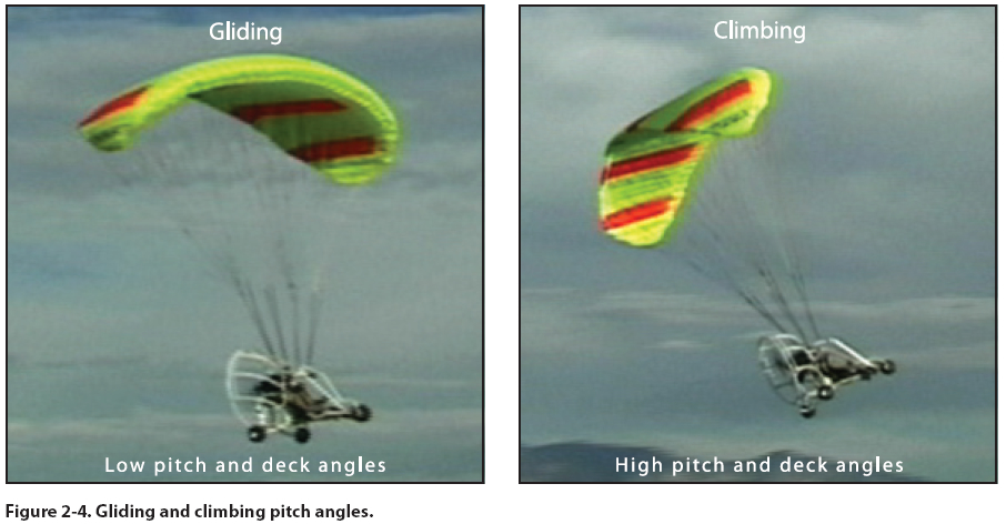 Pitch angle is the angle the PPC wing chord makes with the horizontal plane. Pitch angle is what you can see. Many pilots confuse the pitch angle, which you can easily see and feel, with the angle of attack which may not be as perceptible. [Figure 2-4] For example, the pitch angle in an engine-out glide could be minus 8 degrees, in level flight 10 degrees above the horizon, and in a climb it could be 28 degrees above the horizon. These are significantly different angles you easily see. Pitch angles are covered in greater detail in Chapter 6.