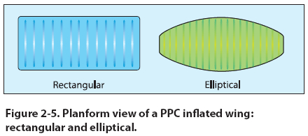 from above. The PPC wing comes in two wing planforms: rectangular, and elliptical. [Figure 2-5] The elliptical planform leading and trailing edges are curved to form an elliptical shape when viewed from the top or bottom. These two shapes have unique flying characteristics. Rectangular wings typically produce more drag, are lower-performance, and do not move fore and aft, relative to the cart, as quickly as elliptical wings. These characteristics are more obvious when the wing is inflating, during pitch changes, and when flying in turbulence. Rectangular wings are therefore more stable and require less effort to fly. Elliptical wings are higher-performance and more efficient due to less drag. Elliptical wings react more quickly with changing conditions and require greater pilot experience and skill during inflation, in turbulent air, and with abrupt throttle changes.