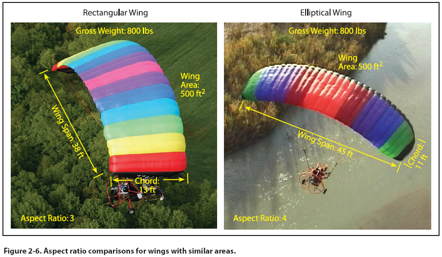 Aspect ratio is the wingspan divided by the average chord line. A PPC with a common 500-square foot rectangular wing (about a 38-foot wingspan) and with a typical mean chord line of 13 feet, would have an average aspect ratio of about 3. This relatively low aspect ratio is less efficient at producing lift. An elliptical wing with the same 500 square feet and a 45-foot wing span and an 11-foot average chord would have an aspect ratio of about 4. The PPC wing is similar to airplane wings in that the aspect ratio will differ with the specific design mission for the aircraft. Generally, rectangular wings have lower aspect ratios and lower efficiency than the higher aspect ratio and higher efficiency elliptical wings. Generally, a high aspect ratio wing, compared to a low aspect ratio wing, produces higher lift at lower angles of attack with less induced drag. [Figure 2-6].