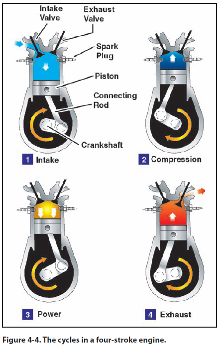 Four-stroke engines are very common in most aircraft categories, and are becoming more common in powered parachutes. [Figure 4-4] Four-stroke engines have a number of advantages, including reliability, fuel economy, longer engine life, and higher horsepower ranges.