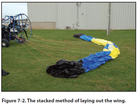 The stacked method of laying out a wing involves piling the wing up like an accordion with all of the suspension lines stretched out as far as possible to the rear of the cart. [Figure 7-2] The pilot can choose to change from the inverted layout to the stacked method on days where a slight wind is blowing or if the pilot is concerned with the condition of the takeoff area. Pavement or areas of the ground not covered in grass in the takeoff runway will make it necessary to get the wing off the ground with as little ground drag as possible to avoid tearing or jeopardizing the integrity of the wing fabric and/or lines.