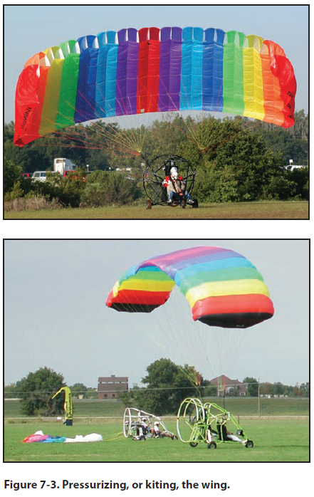 During the takeoff roll of an airplane, the goal is to build sufficient airflow over the wing to generate the lift required to lift the aircraft off the ground. Powered parachutes have two goals during the takeoff roll: to pressurize and raise the wing overhead making sure proper inflation exists for takeoff, and to create the airflow over the wing to generate the necessary lift. [Figure 7-3]