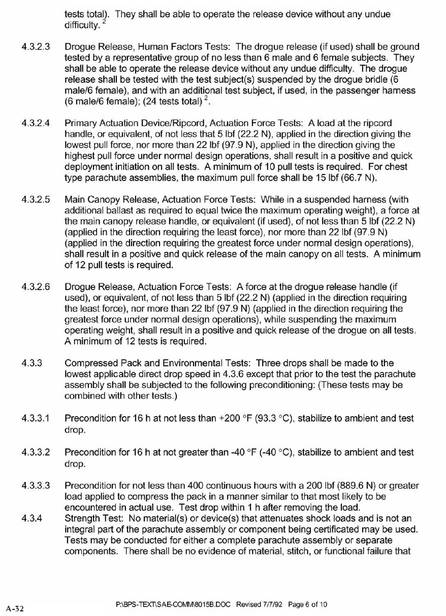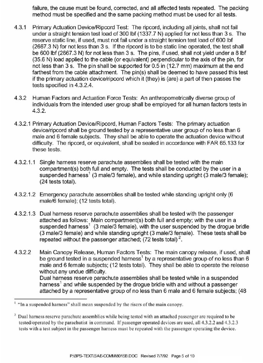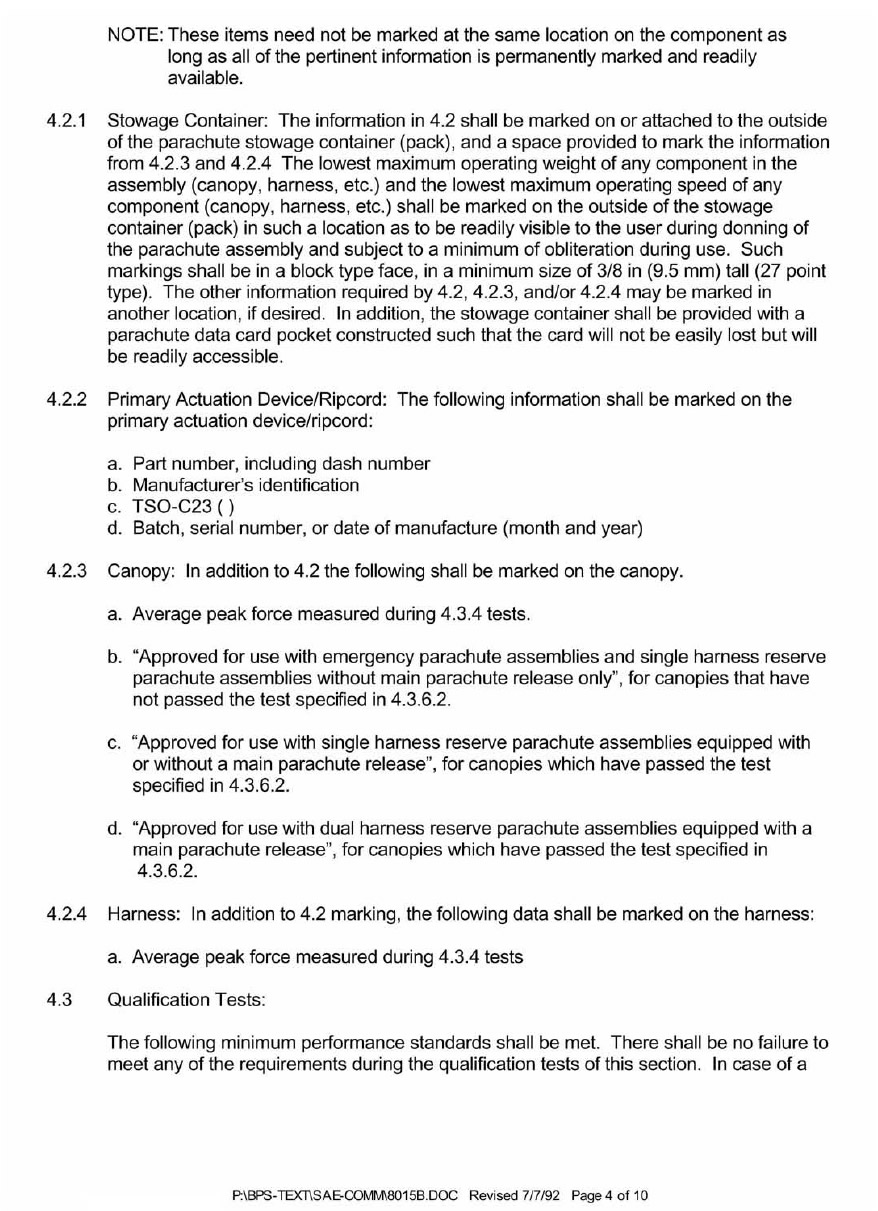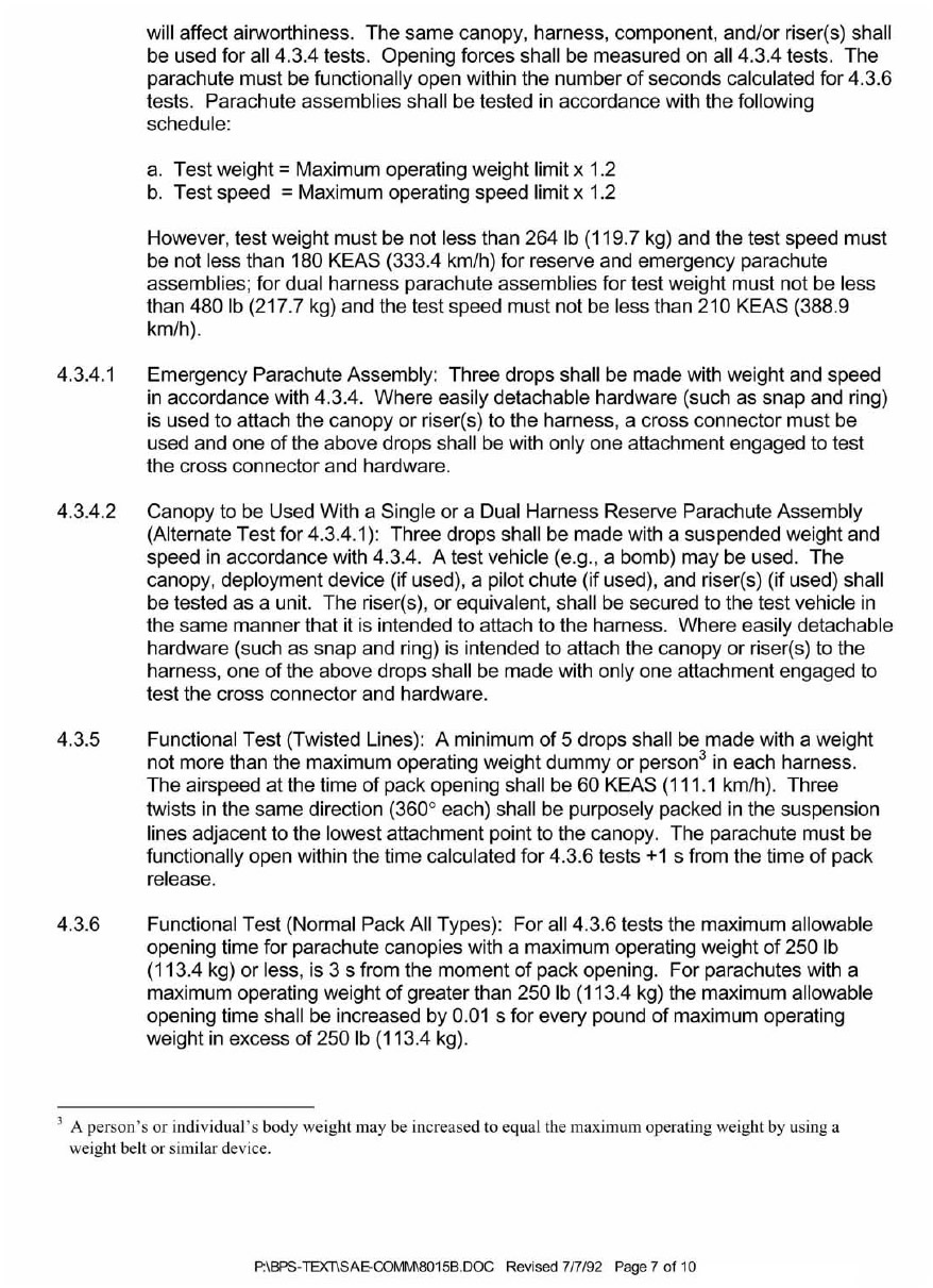 SAE AS 8015B—Minimum Performance Standards for Parachute Assemblies and Components, Personnel