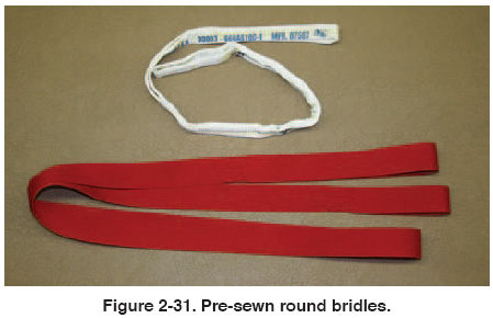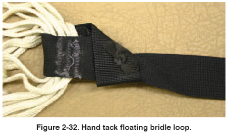There are two basic types of round canopy bridles. The first is a tubular nylon bridle that is tied on. The second is a pre-sewn bridle with loops at each end. The loop of one end is passed thru the attach point on the pilot chute and then back thru itself forming a lark’s head knot. The other loop of the bridle is then similarly attached to the canopy apex. [Figure 2-31] With this type, it is essential for the loop to remain loose to ensure the bridle is free floating and self-centering around the apex lines. Hand tack the loop to ensure this. [Figure 2-32]