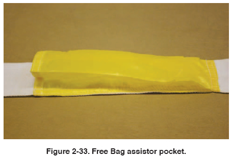 Square reserve bridles are generally built into the free bag. The bridle material is usually 2" wide or more for high drag. The original concept of the free bag is to allow the square reserve to deploy if the reserve pilot chute is captured resulting in a horseshoe-type malfunction. The high-drag bridle would then pull the reserve bag off the parachutist’s back and allow the canopy to deploy free from the bag. In the late 1980s, assistor pockets were added to the bridles for additional drag as square reserves became bigger and heavier. [Figure 2-33]