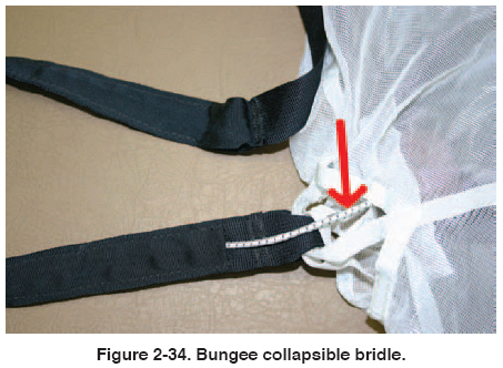 The first is the “bungee” collapsible configuration. This consists of a length of elastic shock cord inside a tape sheath on the bridle near the pilot chute end. [Figure 2- 34] When relaxed, it holds the apex of the pilot chute collapsed. When the pilot chute is deployed into the airstream, the airflow inflates the pilot chute which deploys the canopy. After opening, the elastic pulls the apex down again and collapses the pilot chute, reducing the drag. While this system works, its main drawback is that certain airspeeds are needed to inflate the pilot chute.