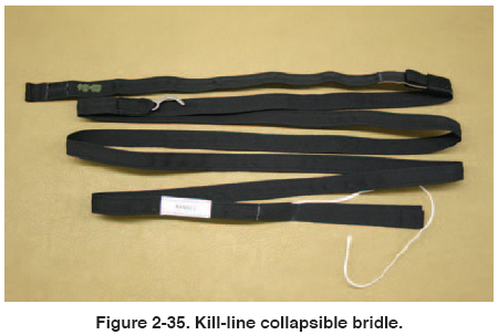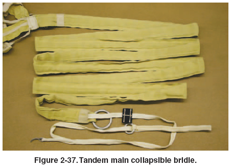 The kill-line configuration is used almost exclusively on tandem systems due to the high speeds involved and the size of the drogue pilot chutes. The bridles are usually made from 2" Kevlar® tape and have tubular nylon centerlines. [Figure 2-37]