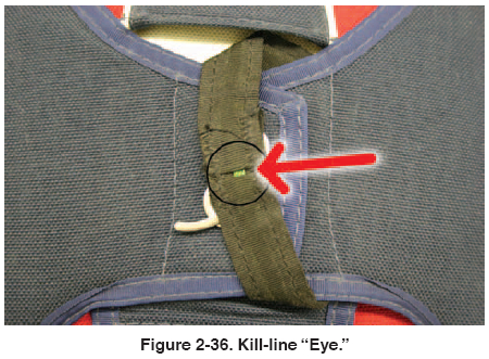 The second type is the “kill-line collapsible” configuration. This consists of a bridle with a full length channel through which passes a line of Kevlar® or Spectra®. [Figure 2-35] The bridle is “cocked” and the lower end of the bridle is collapsed during packing. This allows the pilot chute to inflate immediately. During the deployment sequence, as the canopy inflates, the lower end is stretched to length and the centerline pulls the apex of the pilot chute down and collapses it. This configuration has become almost universal in use for skydiving today. The only drawback is if the user forgets to cock the bridle during packing. This will result in a collapsed pilot chute and a pilot chute in tow. In the early days of use of the kill-line bridle, this was a problem but has become less frequent today. A properly made bridle will have a colored “eye” at the locking pin location to show if it is cocked and the centerline is set correctly. [Figure 2-36]