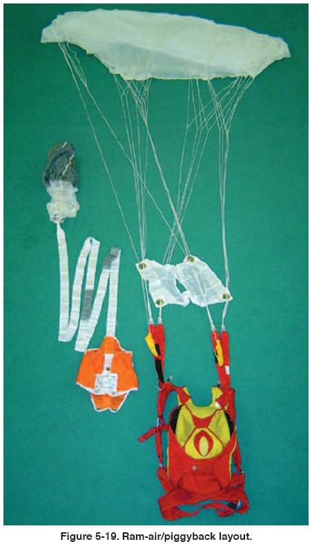Figure 5-19 shows a typical ram-air reserve and harness and container system layout. The terminology used in describing the parts of the ram-air canopy is called out in PIA Technical Standard TS-100, Standardized Nomenclature for Ram-air Inflated Gliding Parachutes, which can be found in the Appendix I of this handbook.