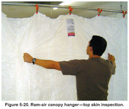1. When inspecting and assembling ram-air canopies, begin with the upper surface of the canopy. [Figure 5-20 on page 5-12] Work your way up and down the top panel of the cells looking for any damage or contamination. Check the seams for loose stitching and packing tabs if used, for security.