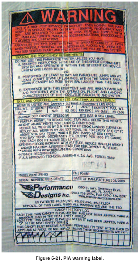 4. Some manufacturers require the use of PIA Technical Standard TS-108, Canopy Fabric Pull Test at certain intervals. In addition, the manufacturer’s warning/TSO label may require that the rigger mark the label to signify each time it is repacked and after each use. [Figure 5-21] This label will be found on the upper surface, trailing edge of the canopy. It is important to comply with this requirement, not only because the manufacturer requires it, but also it establishes the trail of use for the canopy, which allows future riggers (and the manufacturer) to track its use and condition over time. Some riggers feel that they are doing their customers a favor by not marking the boxes in order to show it has little use when it comes to selling it. Since most individuals have a specific rigger pack their parachute on a regular basis, it does not take a lot of detective work to inspect the rigger’s logbook to see how many times they have packed any particular parachute.