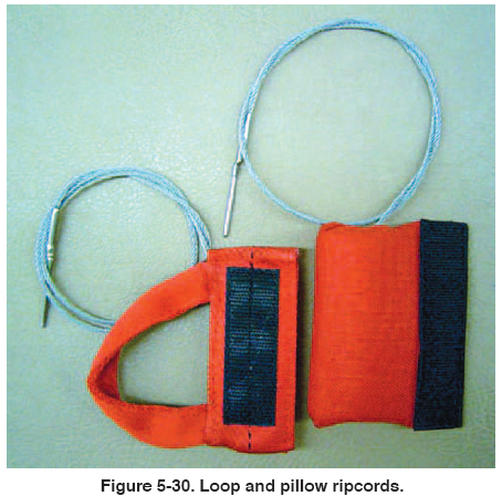All the areas mentioned in the pilot emergency parachute section apply to the sport rig. In addition, some assemblies utilize a ripcord which has a webbing loop handle, or a “pillow” type handle similar to the 3-Ring® release handle. [Figure 5-30] It is important that the rigger check these handles for proper markings and fit to the assembly. Make sure that there is sufficient slack in the cable to allow no loading of the pin in any attitude or position that the wearer may conceivably get into. Most, if not all of these style handles utilize Velcro® to secure them to the harness. Make sure the Velcro® is in good condition for holding ability but not so much as to inhibit the pull force.