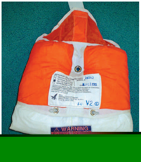 7. When placing the canopy in the bag, allow the folded canopy to stick out 2-3 inches at the mouth of the bag to fill the corners of the reserve container. [Figure 5-101]