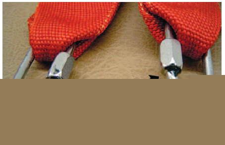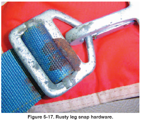 5. An area of concern for many riggers, one for which there is not much guidance, is how much plating wear and associated corrosion of the hardware is allowable. This depends on the location of the damage. If it is a solid ring or buckle, and the damage has occurred from dragging or abrasion in an area that is not in contact with webbing, one solution is to clean the rust with a fine emery cloth and cover it with clear nail polish. This keeps the area from continued rusting. It will not, however, prevent further damage caused by the original rusting. If the rusting is caused by two pieces of hardware interacting with each other, the problem is more serious. If allowed to continue, the rust pattern may cause the two pieces to fuse together under the most severe conditions. In this case, the hardware must be removed and replaced. If the hardware in contact with webbing, such as a leg strap adapter, becomes corroded, it must be replaced. This problem frequently arises when the parachute is exposed to salt water and not properly rinsed. The hardware will rust inside the leg strap webbing causing accelerated wear and must definitely be replaced. [Figure 5-17]