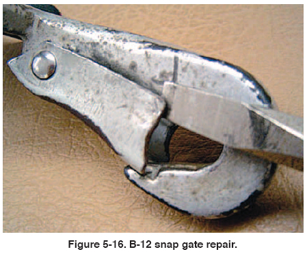 4. Check all of the hardware, paying particular attention to the leg snaps. Quick ejectors are particularly prone to failure of the springs. Obviously, those with broken springs should be replaced. B-12 snaps are prone to having the gate sides bent to the point they will not close properly. This gate may be repaired with a screwdriver and pliers. [Figure 5-16] Straightening the side of the gate allows the snap to close properly.